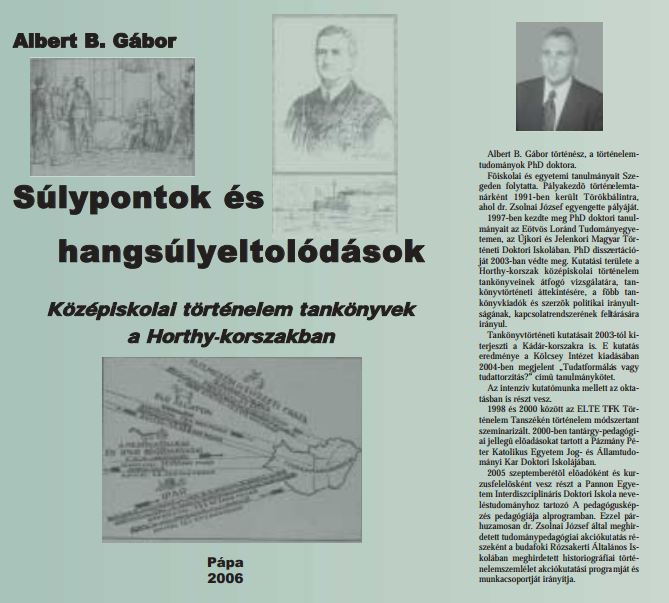 Doktori értekezésem témája a Horthy-korszak középiskolai történelem tankönyveinek átfogó vizsgálatára, tankönyvtörténeti áttekintésére, a főbb tankönyvkiadók és szerzők politikai irányultságának, kapcsolatrendszerének feltárására irányult. Doktori értekezésem szerkesztett, átdolgozott változata „Súlypontok és hangsúlyeltolódások. Középiskolai történelemtankönyvek a Horthy-korszakban” címmel 2006-ban jelent meg. Az írás elérhető itt!